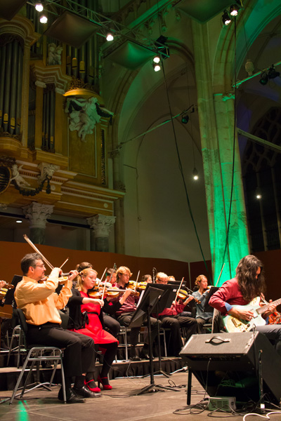 Laatst bezocht ik een heel bijzonder concert in de Eusebiuskerk in Arnhem, ‘Hrfstwnd’. Bijzonder, niet alleen omdat het plaats vond in een kerk in plaats van een theater, maar ook omdat er nauwelijks zitplaatsen waren. Het was de bedoeling dat je als bezoeker rondliep door de ruimte, langs diverse podia waar groepjes muzikanten beurtelings een bijdrage leverden aan het concert. Al lopend kwam het geluid steeds vanuit een andere hoek en kwam je bovendien af en toe een groepje muzikanten tegen dat ook zelf aan de wandel was. De prachtige lichteffecten, de indrukwekkende omgeving en de voortdurende stroom van geluid – wisselend in ritme, volume en richting – maakte het tot een speciale belevenis.