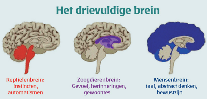 - Afbeelding gekopieerd van: Veldhuizen, R. (2020). Ons reptielenbrein. Stichting Skepsis. https://skepsis.nl/reptielenbrein/