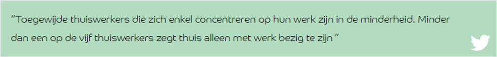 Uit het lezersonderzoek van Intermediair blijkt dat drie op de vijf thuiswerkers als voordeel van thuiswerken benoemt: ‘tussendoor even andere dingen doen’ (61%). Maar, zo schrijft Intermediair, dat voordeel is tegelijk een valkuil. De respondenten die aangeven thuiswerken niet prettig of helemaal niet prettig te vinden (3%), noemen als belangrijkste reden daarvoor dat thuis te veel risico op afleiding bestaat.