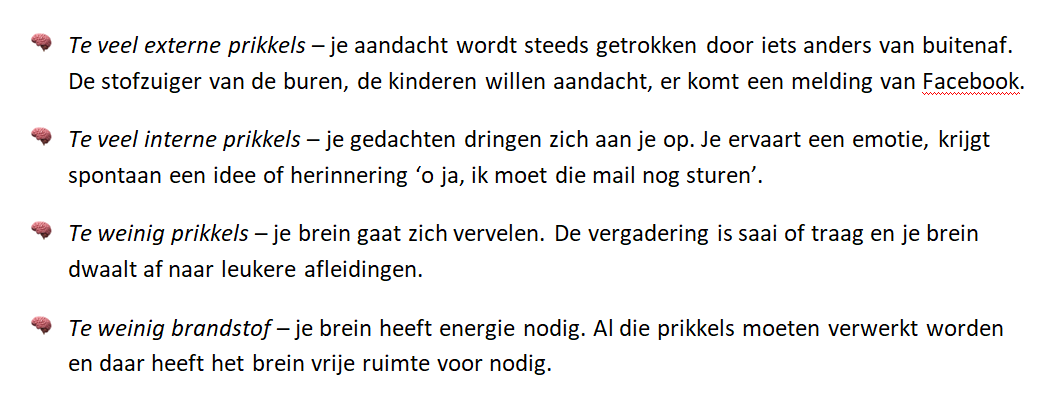 Onze neiging om toe te geven aan afleidingen komt voort uit een oeroude respons van ons brein, die ooit cruciaal was voor onze overleving. Het onbewuste deel van je brein is namelijk ingesteld om op prikkels te reageren. Dat was ooit noodzakelijk, maar in onze huidige maatschappij zijn er zoveel prikkels, dat het brein niet meer overal op kan reageren, maar het doet wel dappere pogingen: elk geluidje van je smartphone roept een behoefte op om te reageren. En als je dat doet, dan reageert het brein met een verhoogde afgifte van dopamine, waardoor je bij het volgende piepje meteen weer wil reageren.