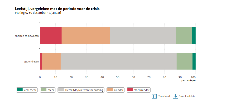 Maar ook ons beweegpatroon staat onder druk. Onderzoek van het RIVM laat zien dat 45% minder is gaan sporten (al is er ook een groep van twaalf procent die juist meer is gaan sporten), zie onderstaand plaatje.