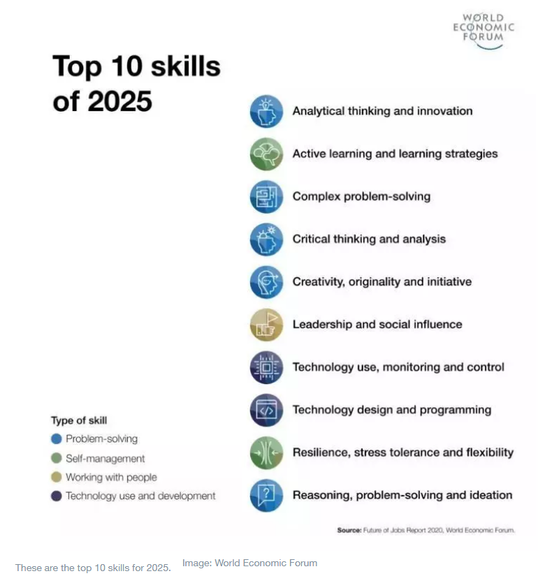 Het World Economic Forum onderscheidt een top tien van vaardigheden die van cruciaal belang zouden zijn om in de toekomst op de arbeidsmarkt te kunnen functioneren en om dat ondanks alle veranderingen in je omgeving te blijven doen. Op de vijfde plaats staat ‘creativiteit, originaliteit en initiatief’. En ook bij een aantal andere gevraagde vaardigheden, zoals ‘innovatie’, ‘complexe problemen oplossen’ en ‘kritisch denken’ is een zekere mate van creativiteit ook wel handig.